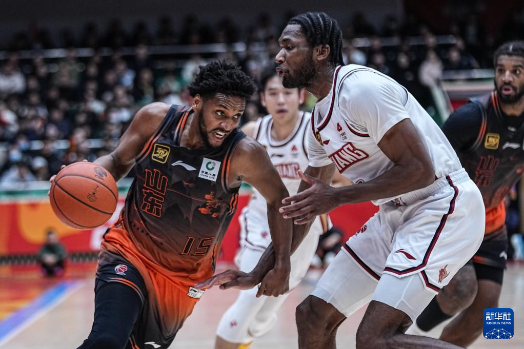 1月15日,山东高速队球员克里斯(右)在比赛中进攻。