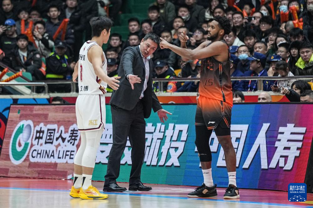 1月15日,浙江稠州金租队球员约克(中)在比赛中和队友琼斯(右)交流。