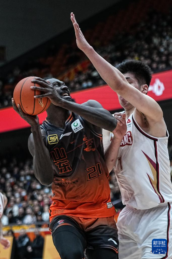 1月15日,山东高速队球员库马杰(右)在比赛中扣篮。
