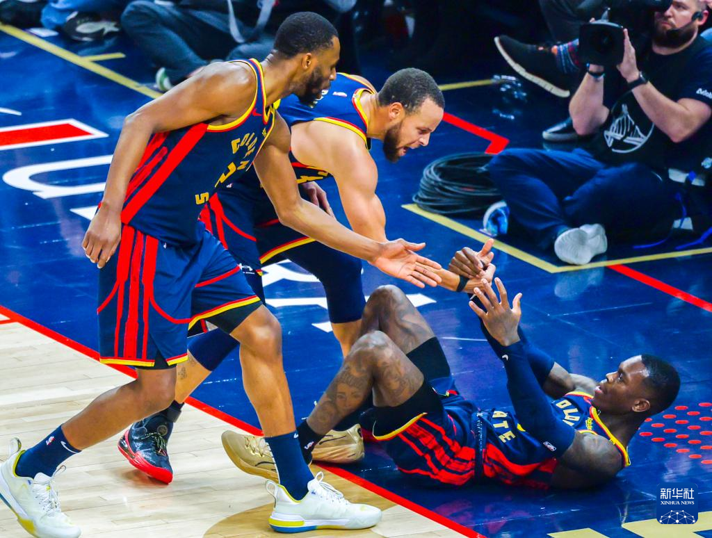 1月29日,勇士队球员库里(中)在比赛中扶起摔倒的队友施罗德。