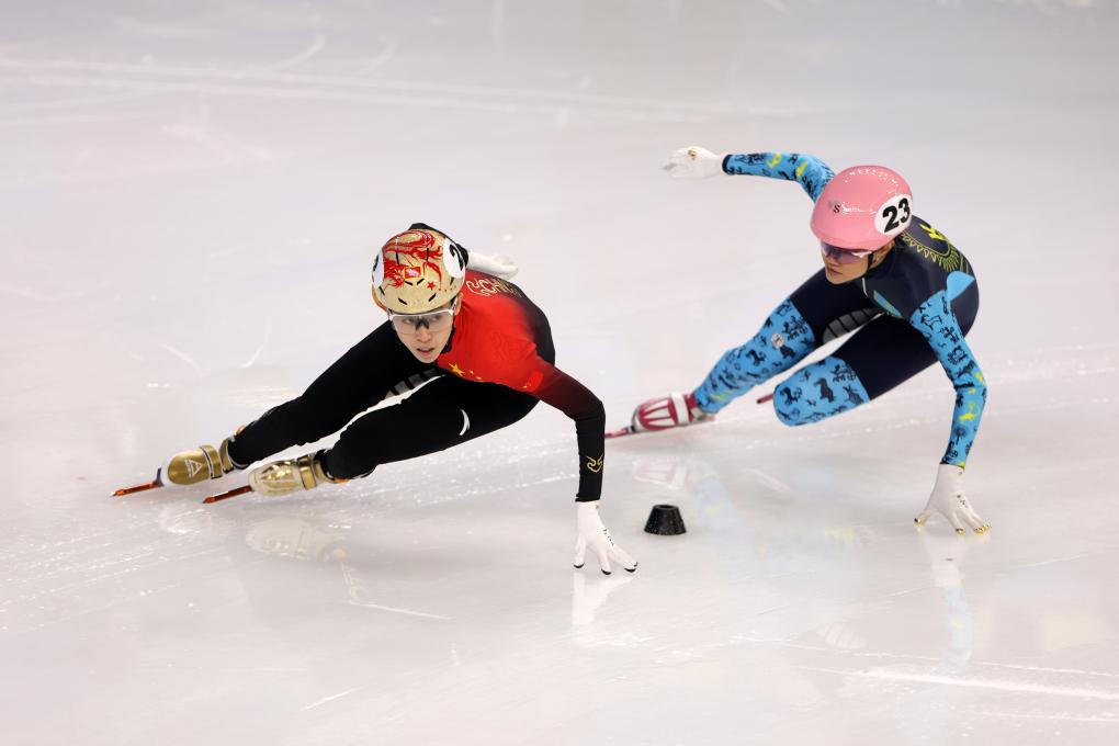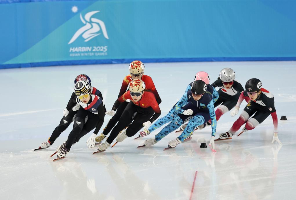 在北京冬奥会上和范可新一起为中国队夺得混合接力金牌的曲春雨是亚冬会的开幕式执旗手之一,她8日在短道速滑赛场为队友们助威。