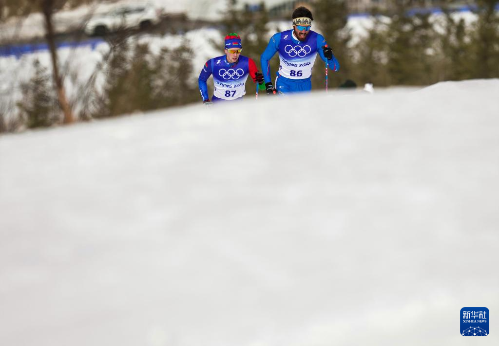 这是马克·尚隆(右)参加北京冬奥会越野滑雪男子15公里(传统技术)比赛中(2022年2月11日摄)。