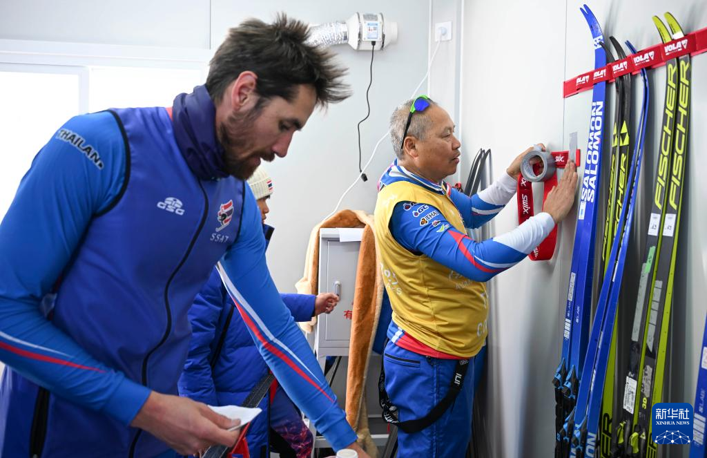 这是马克·尚隆(左)和父亲汶参·尚隆在位于亚布力的第九届亚冬会越野滑雪场地的打蜡房工作(2025年2月6日摄)。