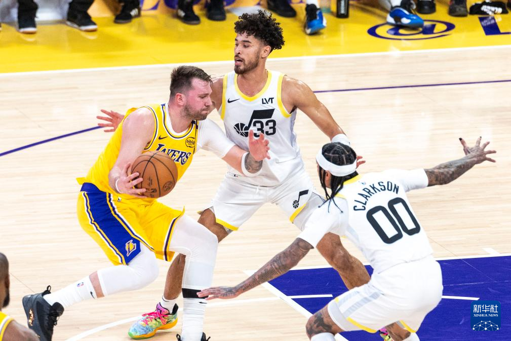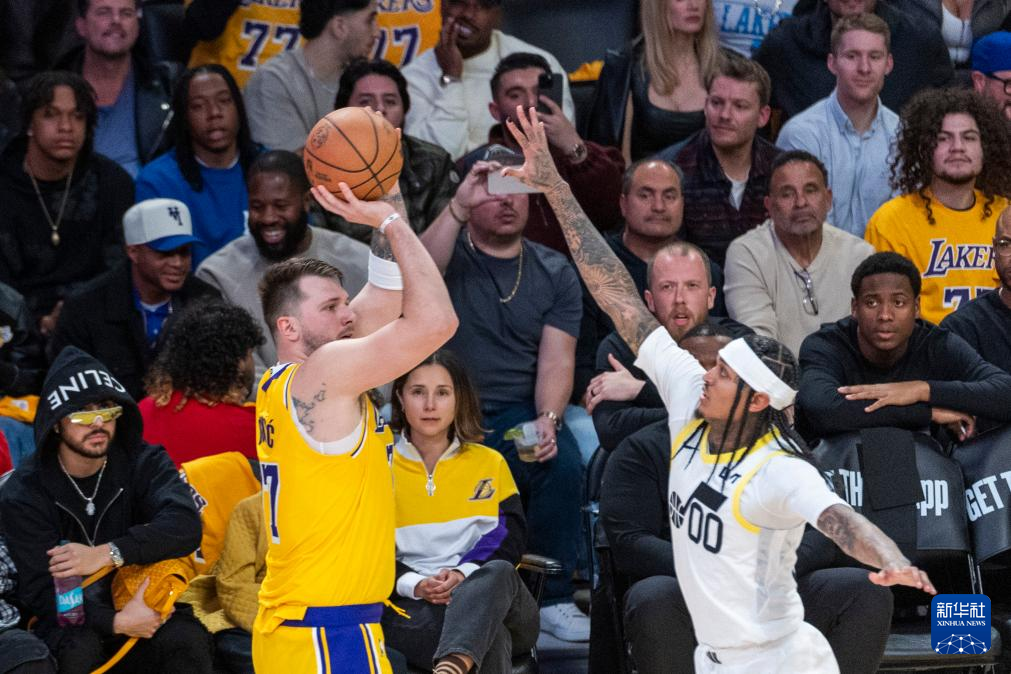 2月10日,湖人队球员卢卡·东契奇(左二)在比赛中投篮。