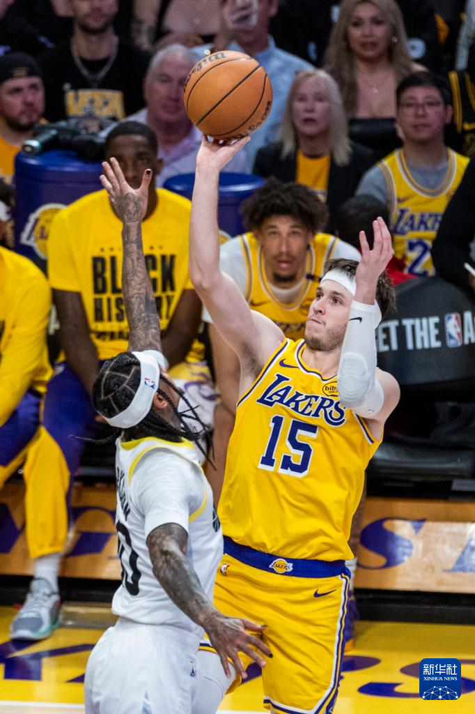 2月10日,湖人队球员奥斯汀·里夫斯(右)在比赛中投篮。