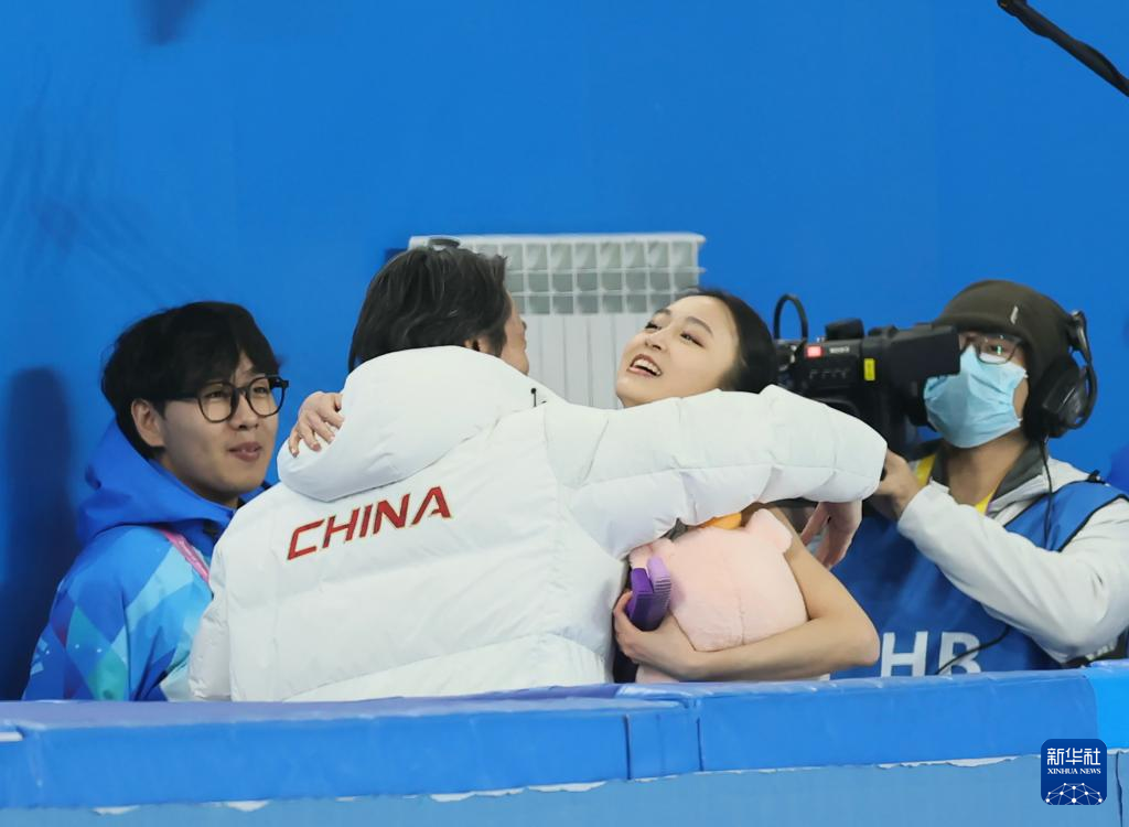 2月12日,中国选手朱易(右二)在比赛后和教练拥抱。