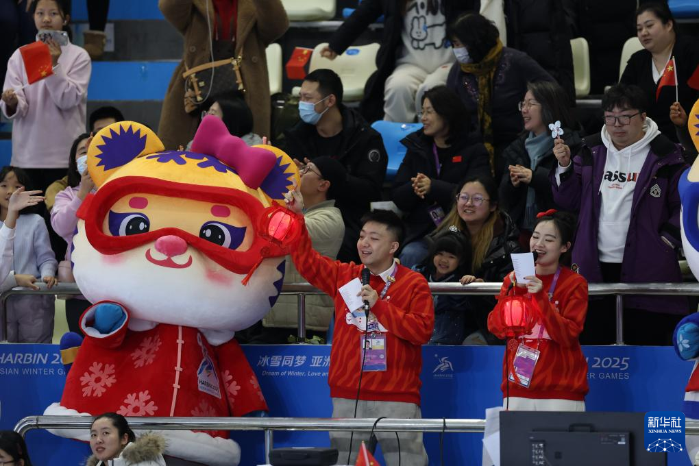 2月12日,花样滑冰赛场主持人与观众互动,庆祝元宵节。