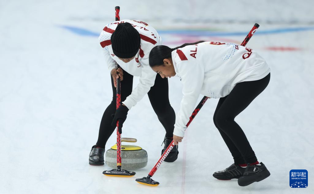 2月12日,卡塔尔队选手哈塞娜·哈桑·阿尔-法赫德、阿尔达娜·艾哈迈德·阿尔-法赫德(右)在比赛中。最终,卡塔尔队1比10不敌泰国队。