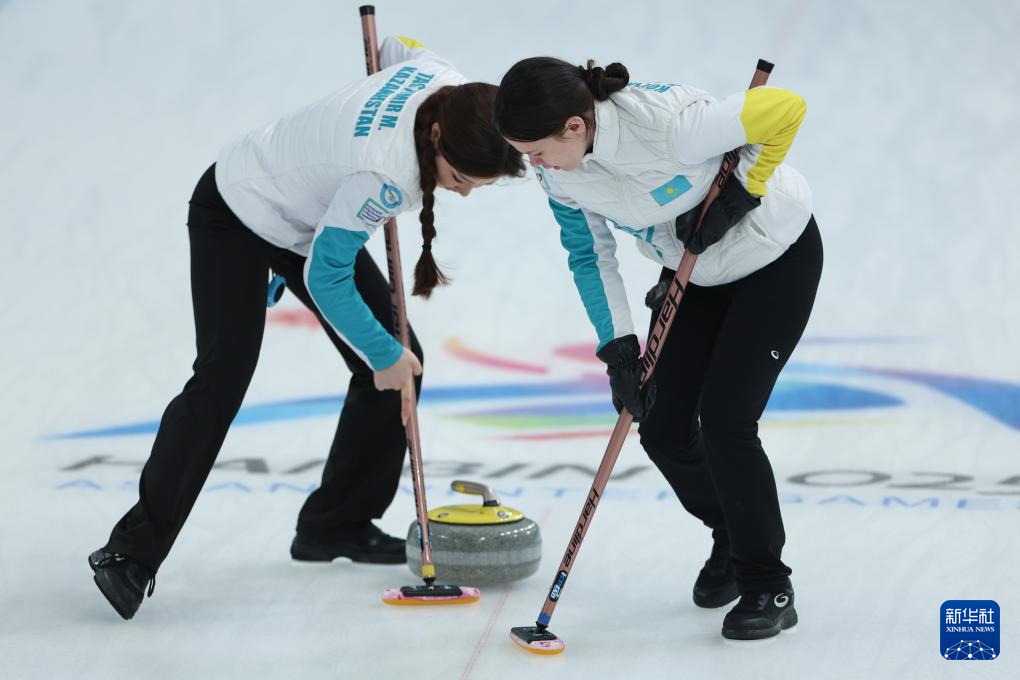 2月12日,哈萨克斯坦队选手叶卡捷琳娜·科雷哈洛娃、梅赖伊·塔什捷米尔y(左)在比赛中。最终,哈萨克斯坦队2比8不敌韩国队。