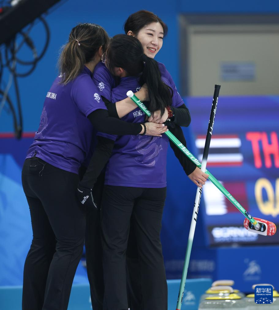 2月12日,中国香港队选手赛后拥抱庆祝。最终,她们8比1战胜中国台北队。