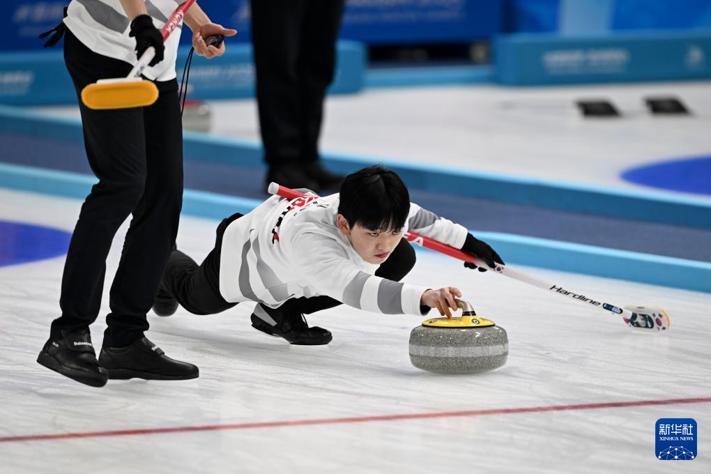 2月13日,韩国队选手李在秉在比赛中掷壶。