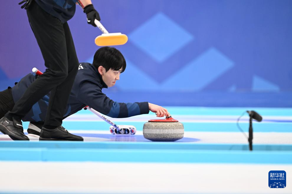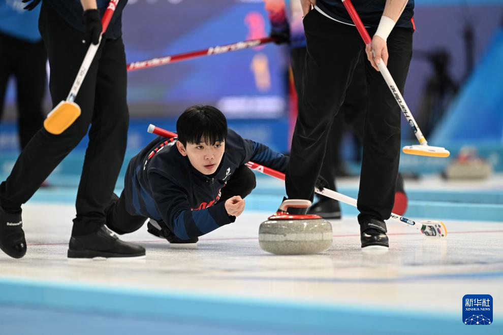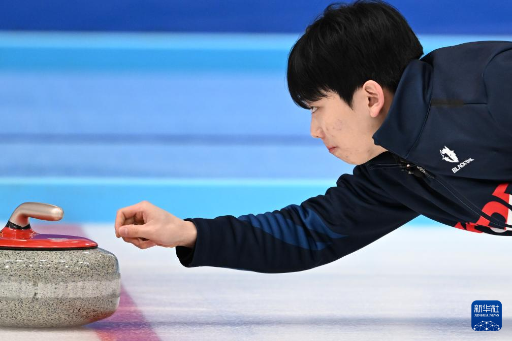 2月14日,韩国队选手李在秉在比赛中掷壶。
