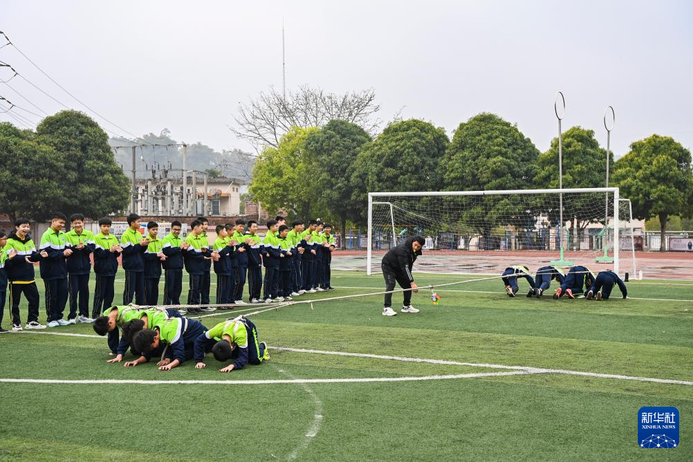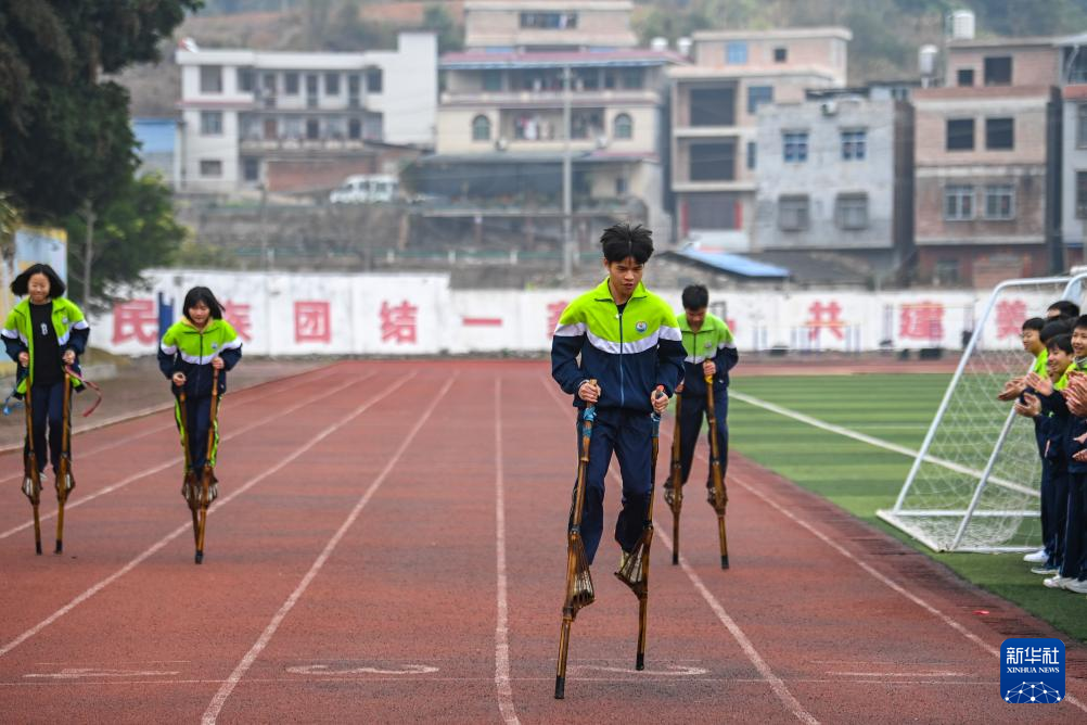 2月19日,在位于广西兴业县的玉林市民族中学,学生们在体育课上学习高脚竞速。新华社记者 曹祎铭 摄