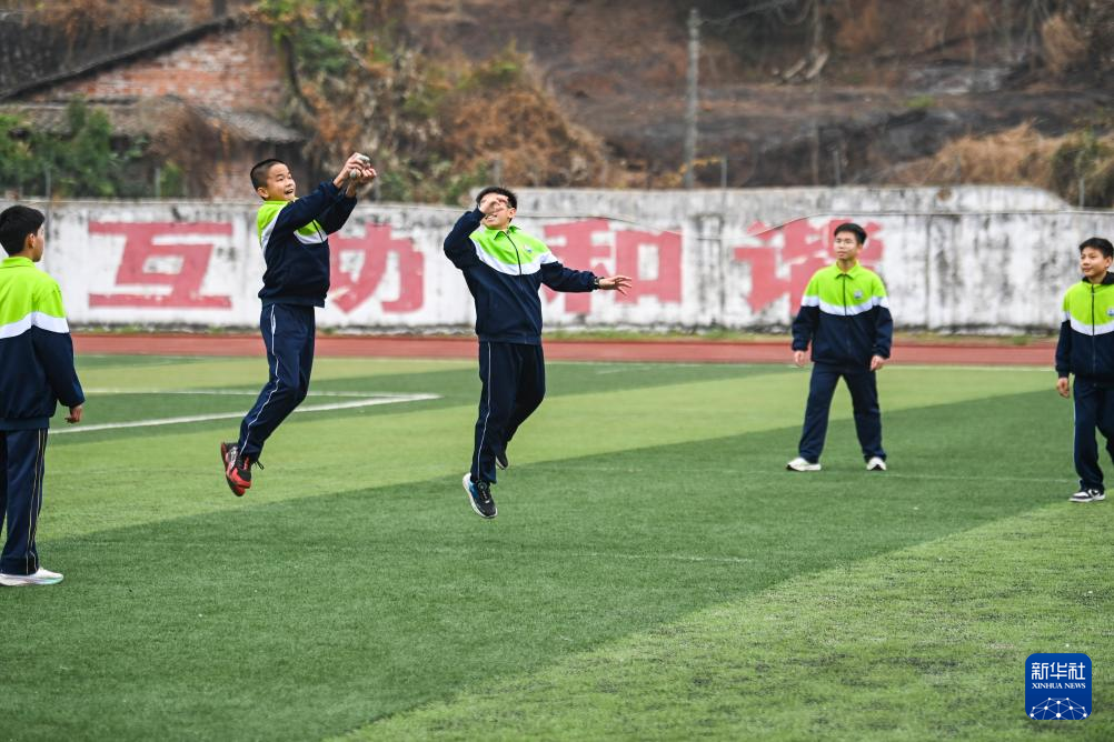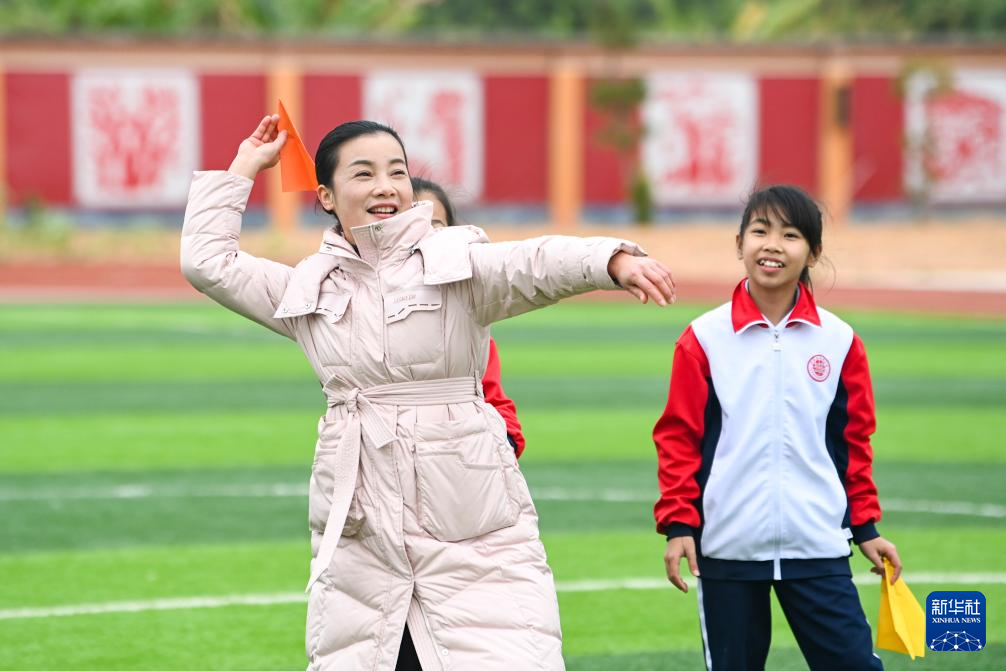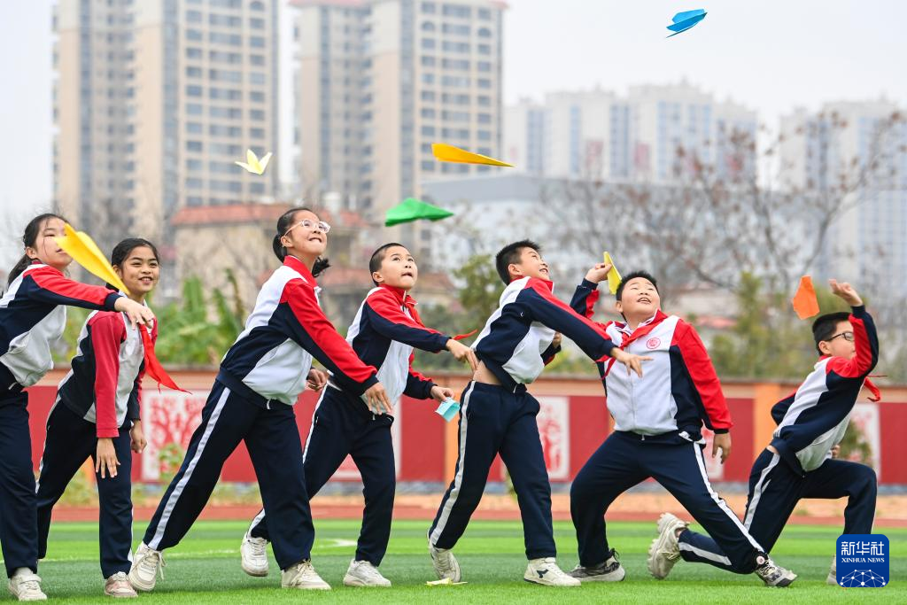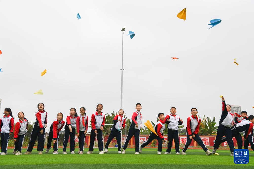 2月18日,在广西兴业县第三实验小学,校长梁嗣银(左)与学生们一起在体育课上投掷纸飞机。新华社记者 曹祎铭 摄