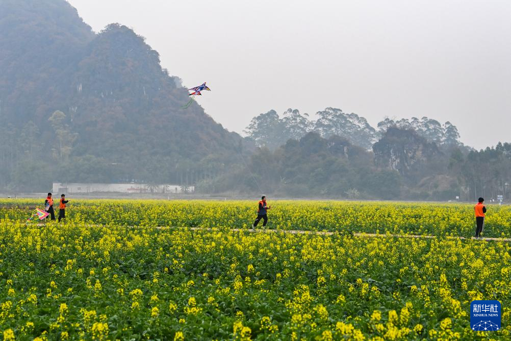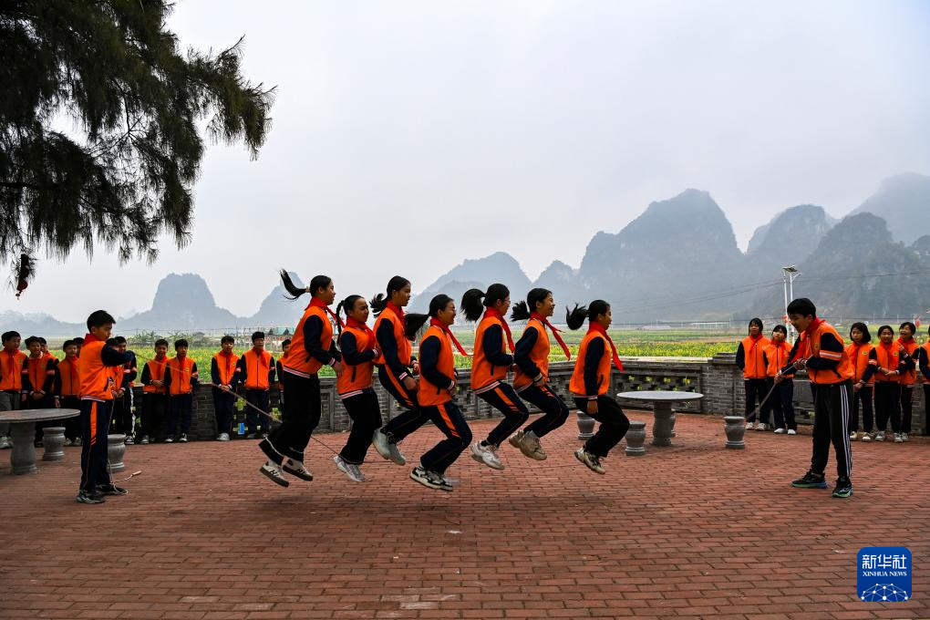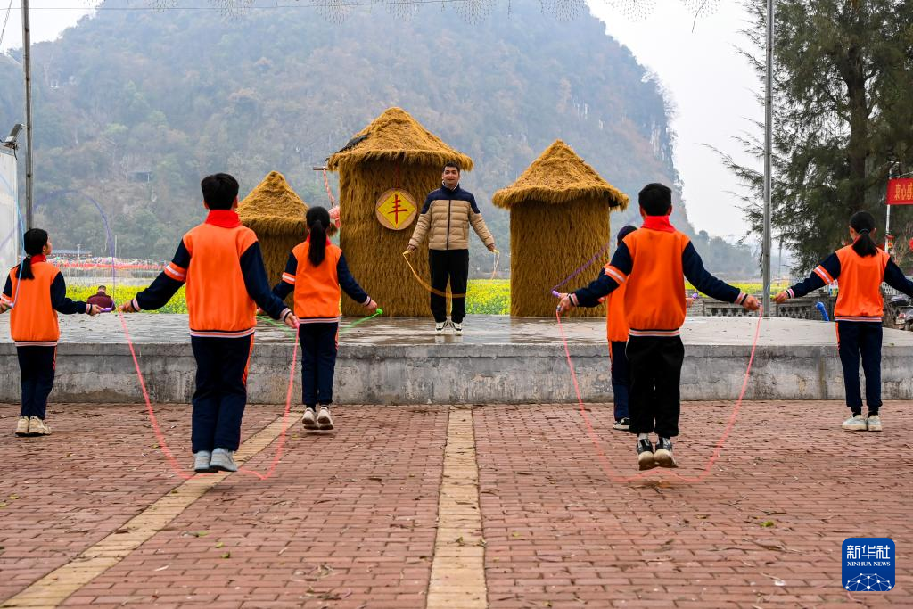 2月19日,在广西兴业县葵阳镇一处油菜花田边,泉江小学的学生们在集体跳绳。新华社记者 曹祎铭 摄