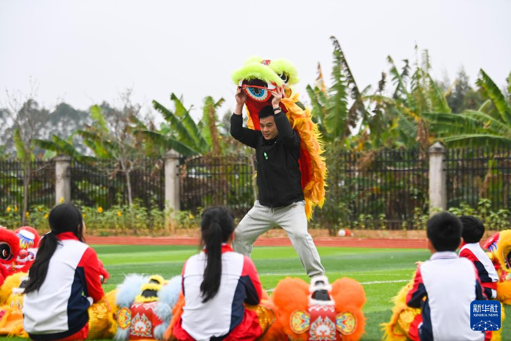 2月18日,在广西兴业县第三实验小学,体育老师欧剑在教授舞狮的基本动作。新华社记者 曹祎铭 摄