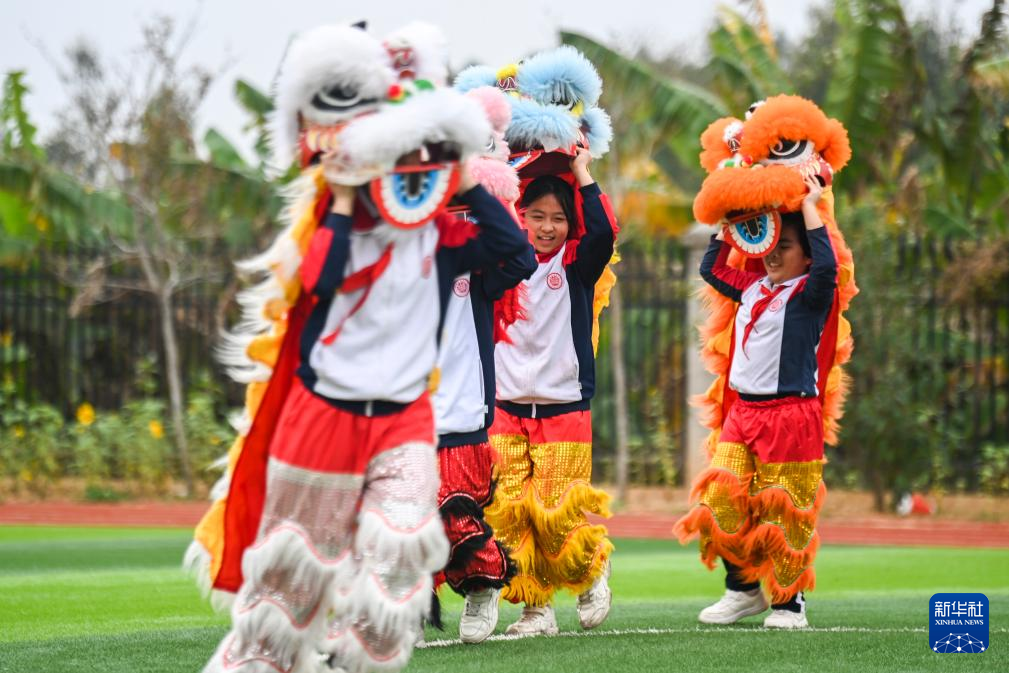 2月18日,在广西兴业县第三实验小学,学生们在体育课上练习舞狮。新华社记者 曹祎铭 摄