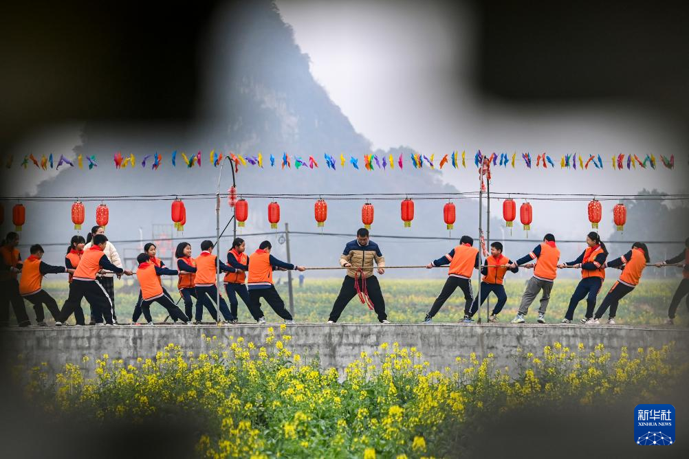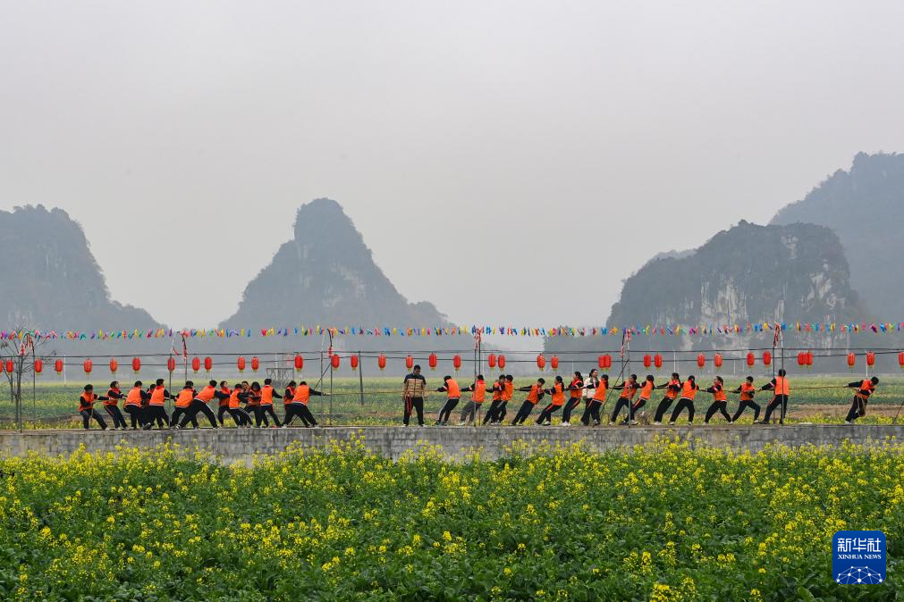 2月19日,在广西兴业县葵阳镇一处油菜花田边,泉江小学的学生们在进行拔河比赛。新华社记者 曹祎铭 摄