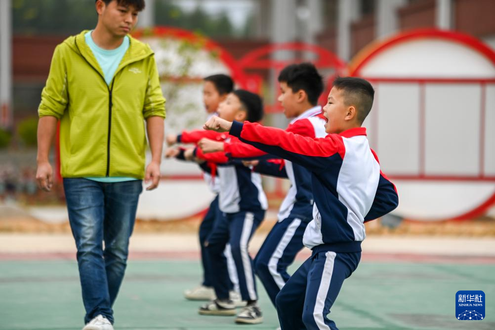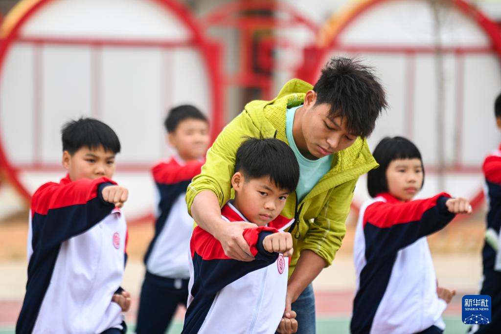 2月18日,在广西兴业县第三实验小学,体育老师李永奎(左一)带领学生练武术。新华社记者 曹祎铭 摄