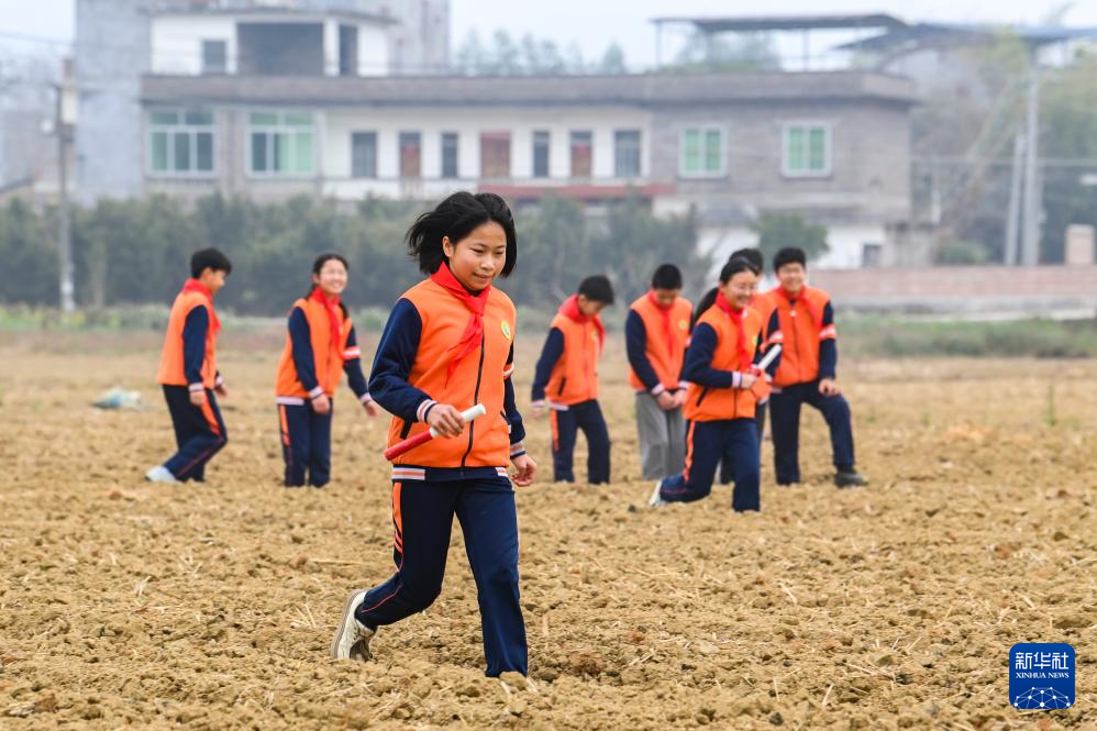 2月19日,在广西兴业县葵阳镇一处农田,学生们在进行越野接力赛。新华社记者 曹祎铭 摄
