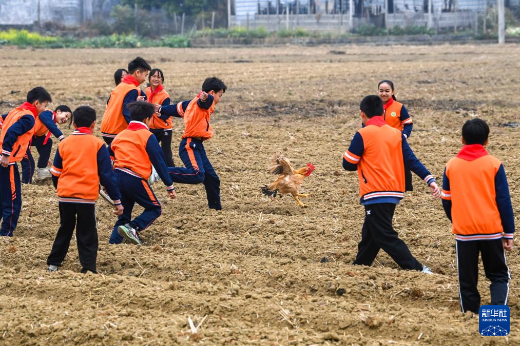 2月19日,在广西兴业县葵阳镇一处农田,学生们在进行抓鸡比赛。新华社记者 曹祎铭 摄