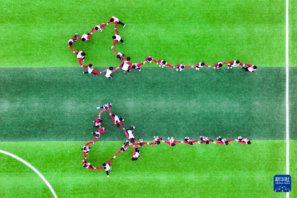 2月18日,在广西兴业县第三实验小学,学生们在进行“穿针引线”趣味运动(无人机照片)。