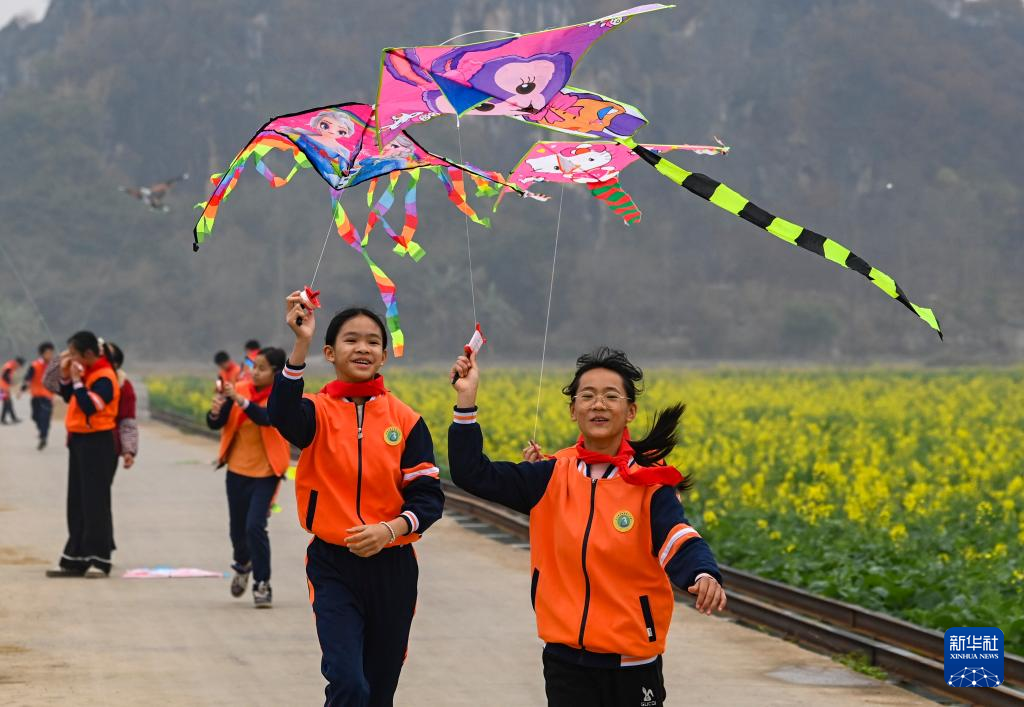 2月19日,在广西兴业县葵阳镇一处农田,学生们在机耕路上放风筝。新华社记者 曹祎铭 摄