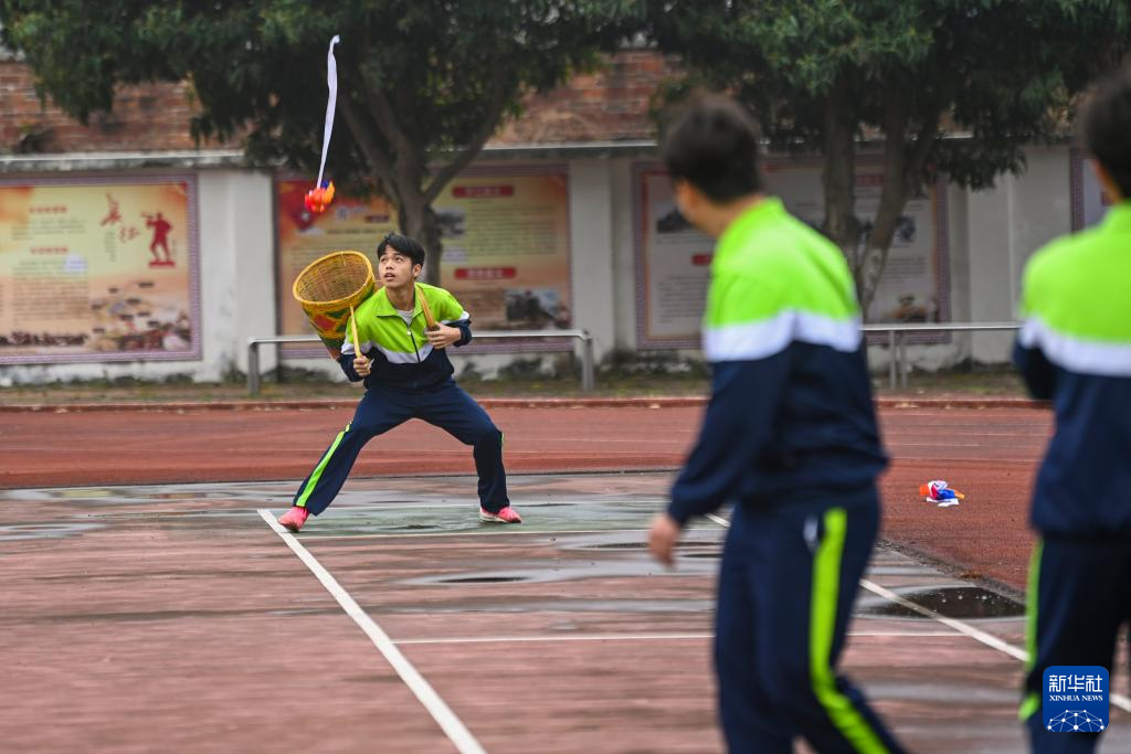 2月19日,在位于广西兴业县的玉林市民族中学,学生们在体育课上进行背篓绣球的比赛。新华社记者 曹祎铭 摄