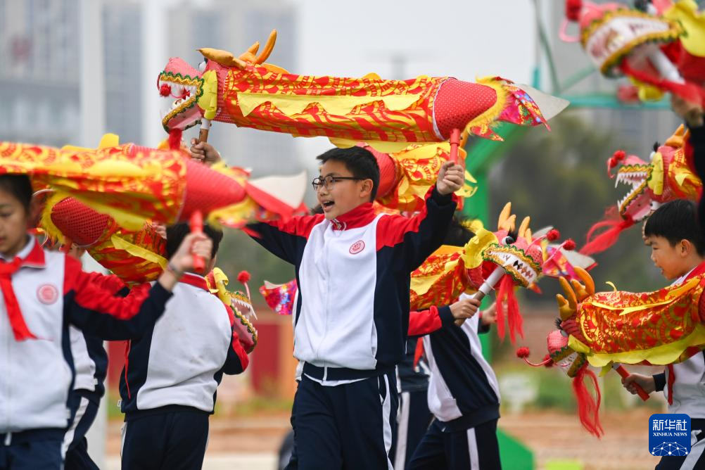 2月18日,在广西兴业县第三实验小学,学生们在体育课上练习单人舞龙。新华社记者 曹祎铭 摄