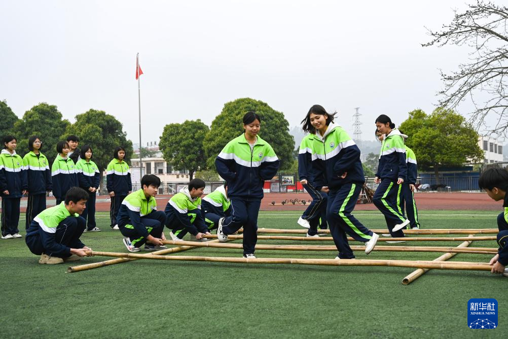2月19日,在位于广西兴业县的玉林市民族中学,学生们在体育课上学跳竹竿舞。新华社记者 曹祎铭 摄