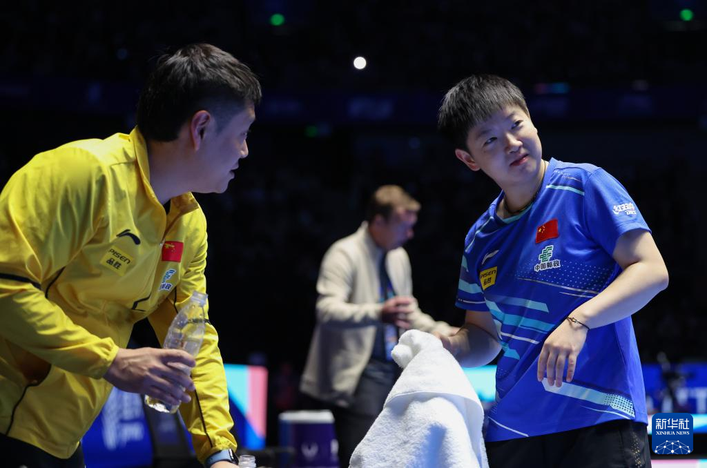 2月21日,孙颖莎(右)在比赛间隙与教练邱贻可交流。