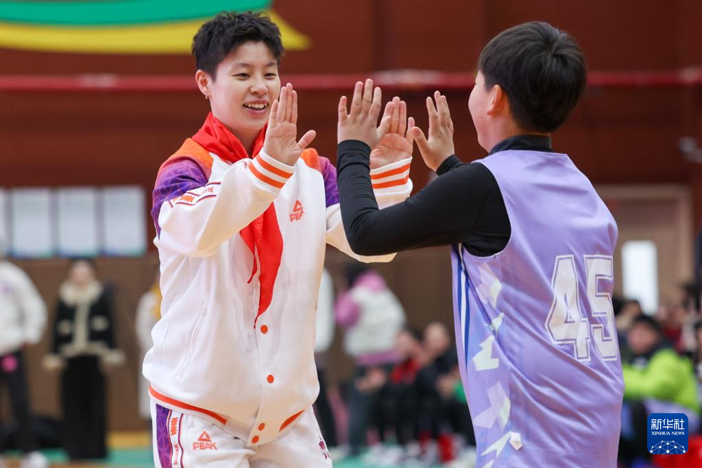 2月22日,来自内蒙古农信队的WCBA全明星正赛球员李缘(左)在活动现场与杭州市星洲小学的学生互动。