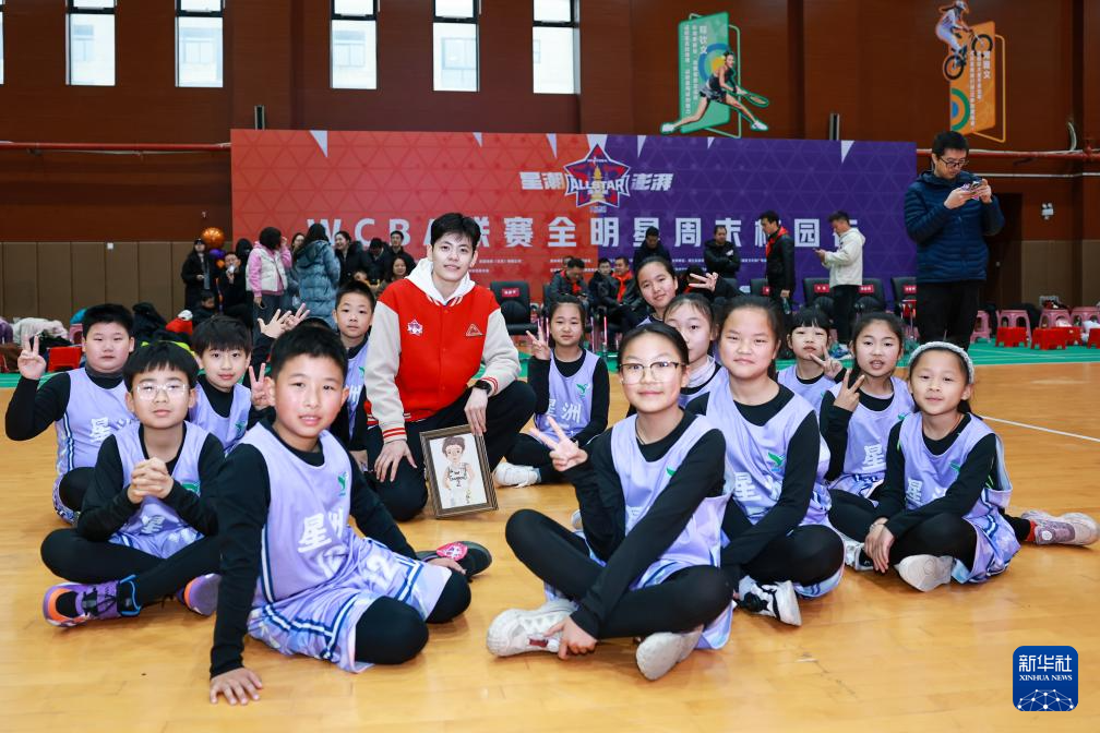 2月22日,来自东莞新彤盛队的WCBA全明星正赛球员杨舒予在活动现场与杭州市星洲小学的学生合影。