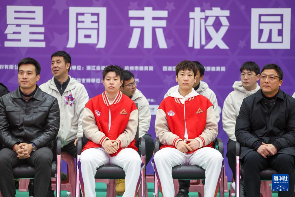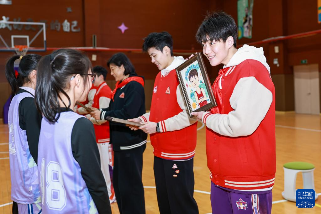 2月22日,杭州市星洲小学学生向来自合肥文旅队的WCBA全明星正赛球员王维琳(右一)赠送礼物。