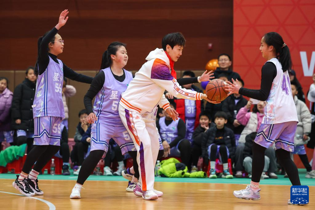 2月22日,来自山东赤水河酒队的WCBA全明星正赛球员曹君伟(右二)在活动现场与杭州市星洲小学的学生进行对抗赛。