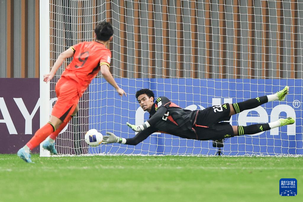 2月22日,中国队球员刘诚宇(左)的点球射门被沙特阿拉伯队守门员哈米德·阿卜杜拉·优素福扑出。