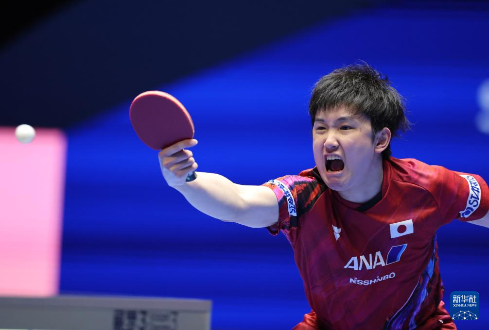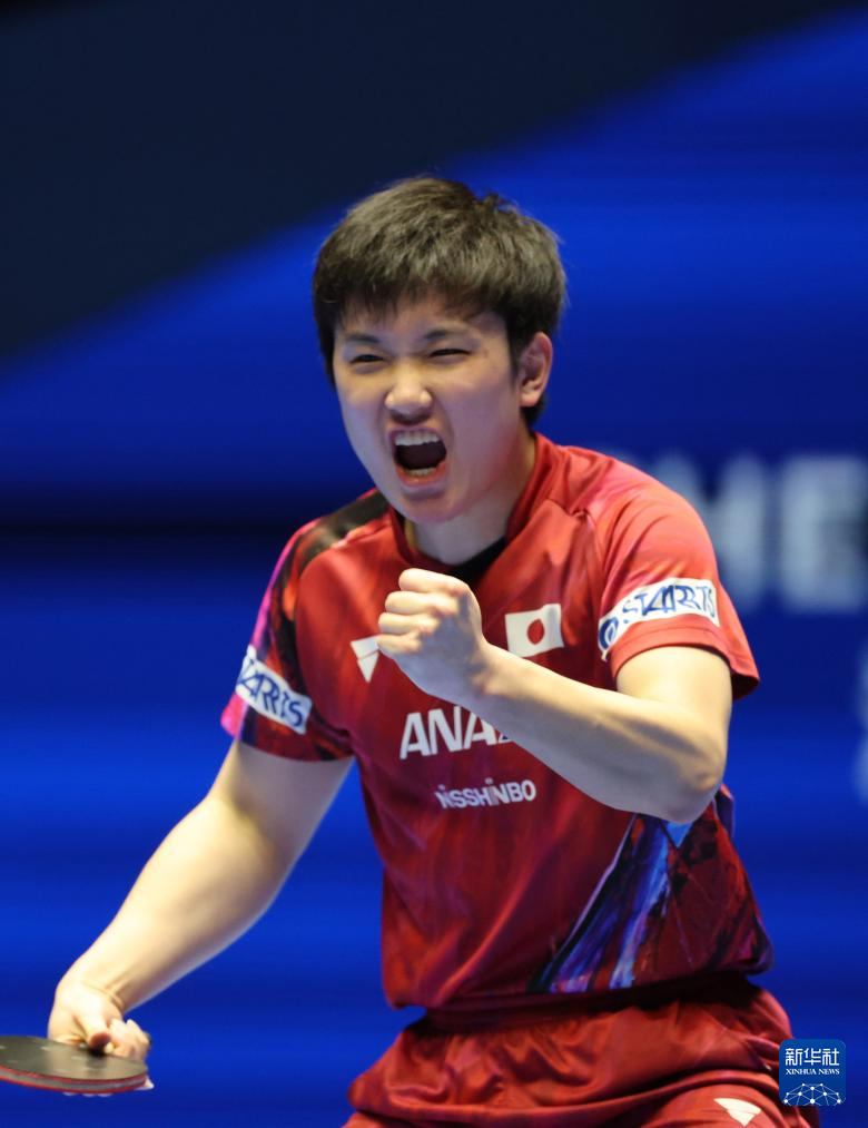 2月22日,张本智和在比赛中庆祝得分。