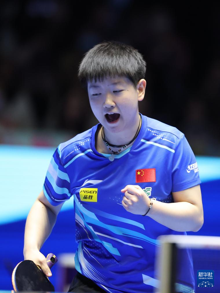 2月22日,孙颖莎在比赛中庆祝得分。