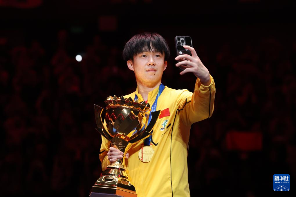 2月23日,王楚钦在颁奖仪式上捧杯。