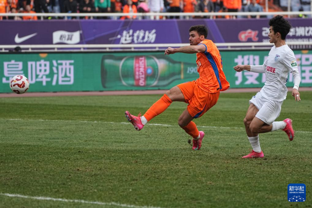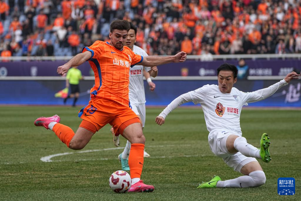 2月28日,山东泰山队球员泽卡(左)在比赛中射门。