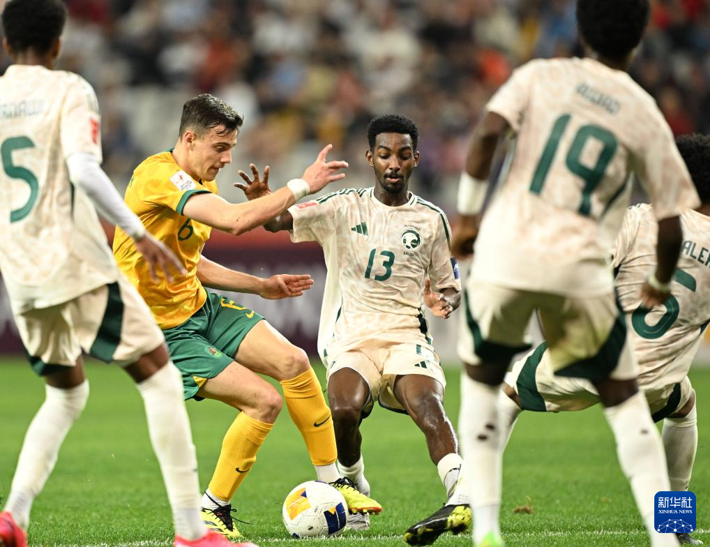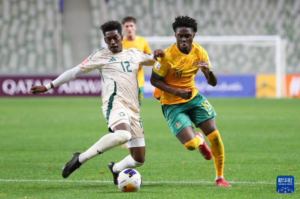 3月1日,沙特阿拉伯队球员纳瓦夫·阿卜杜拉·古拉伊米什(左)与澳大利亚队球员穆萨·杜尔在比赛中拼抢。