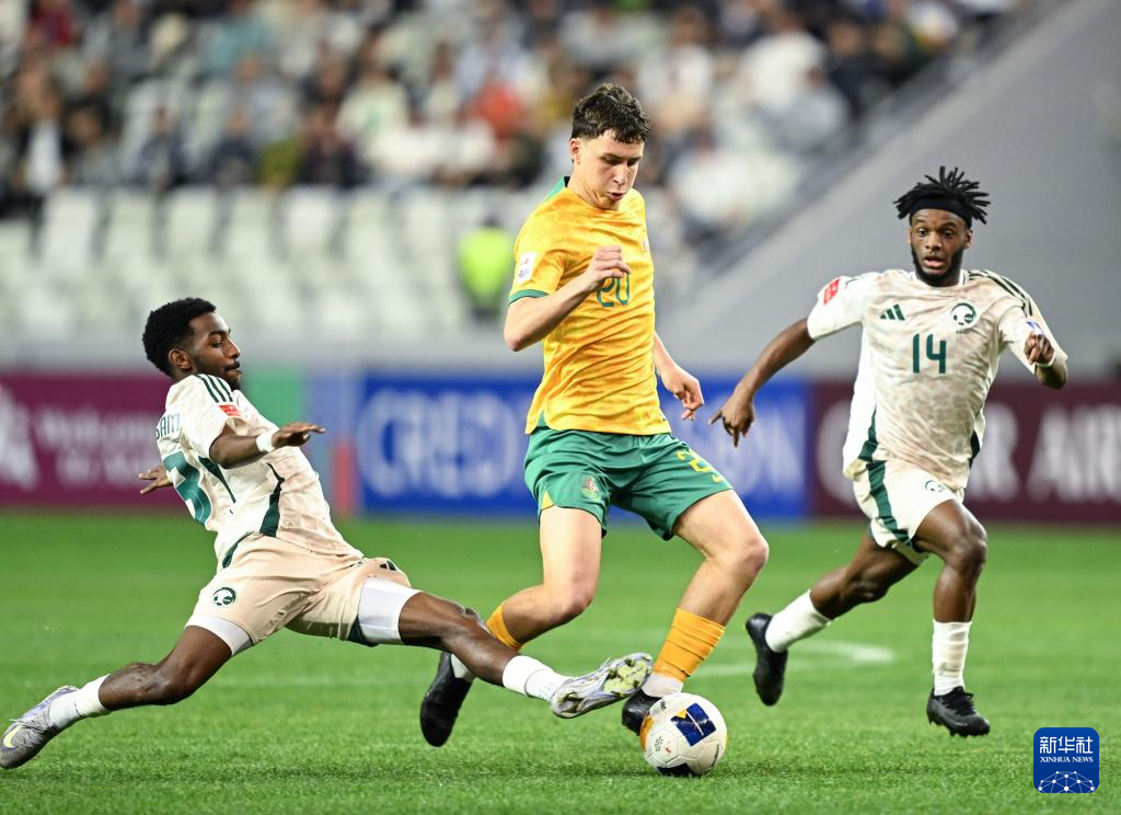 3月1日,沙特阿拉伯队球员巴萨姆·阿卜杜拉·哈扎齐(左)在比赛中拦截澳大利亚队球员路易斯·阿戈斯蒂(中)的进攻。