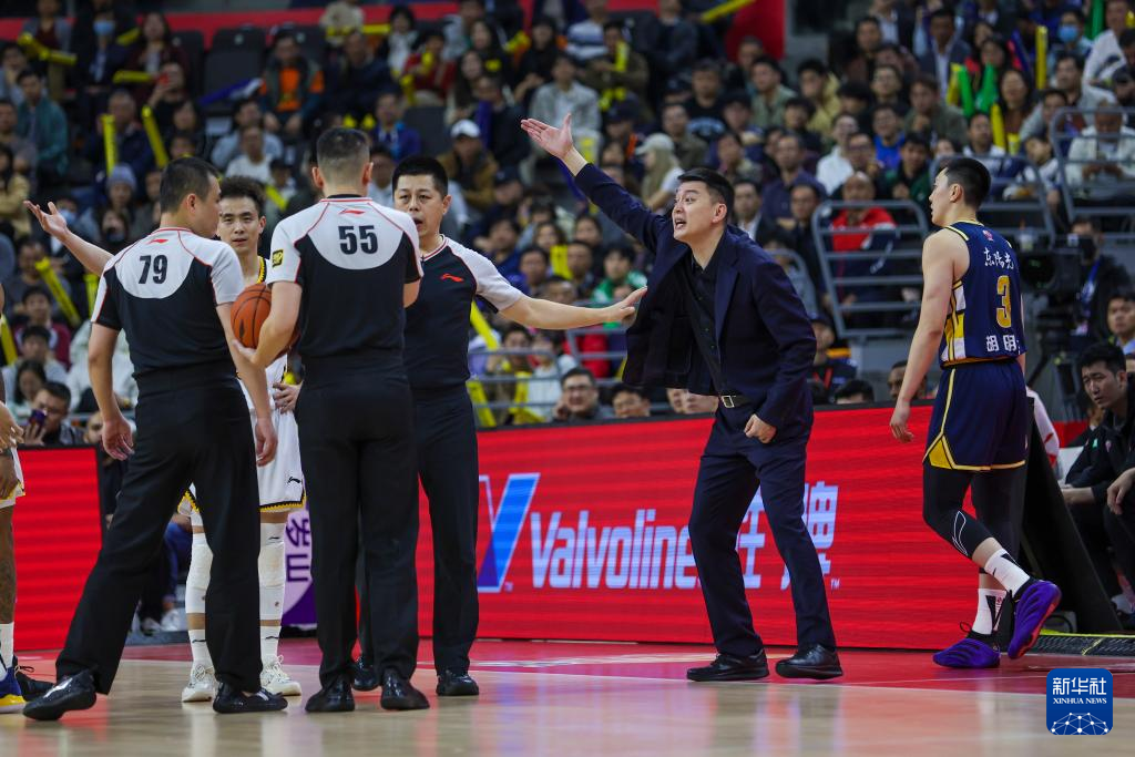 3月5日,辽宁本钢队主教练杨鸣(右二)在比赛中与裁判沟通。