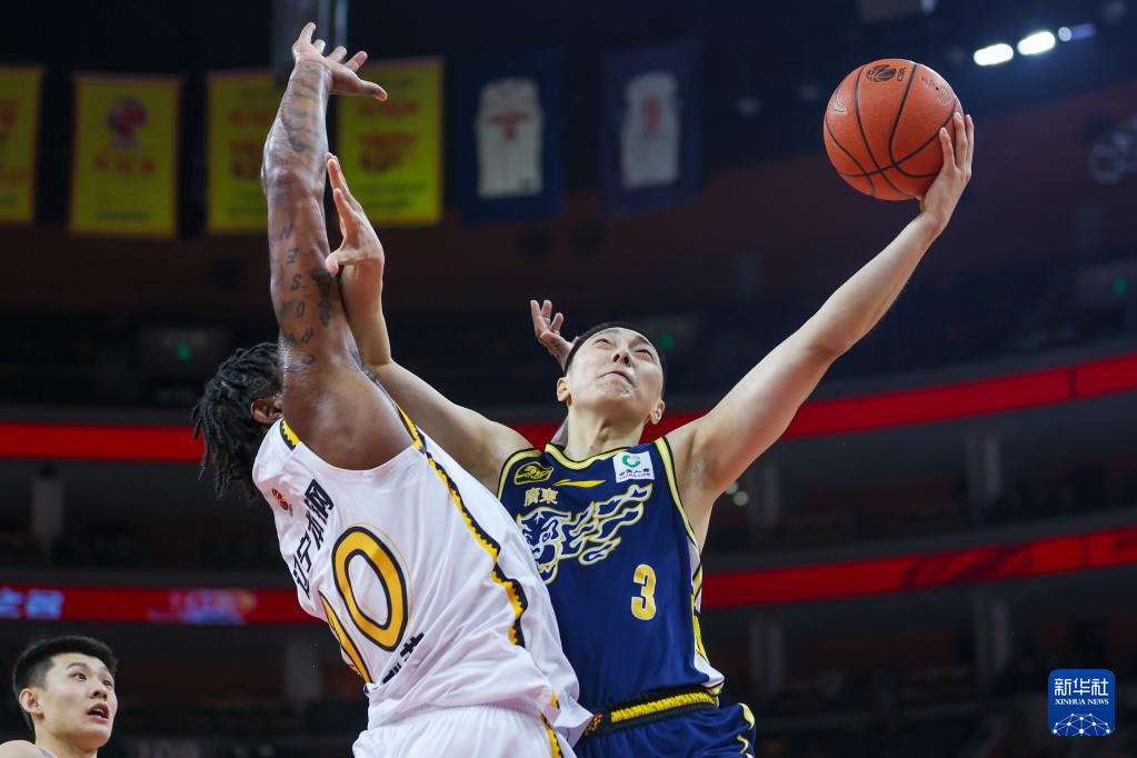3月5日,广东东阳光队球员胡明轩(右)在比赛中上篮。