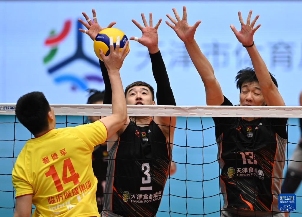 3月6日,天津食品集团队球员毛天一(中)、与队友陈龙海(右)在比赛中拦防山东松山小镇队球员翟德军的扣球。