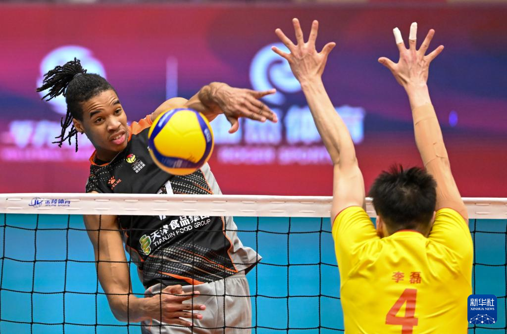 3月6日,天津食品集团队球员亚历杭德罗(左)在比赛中扣球。