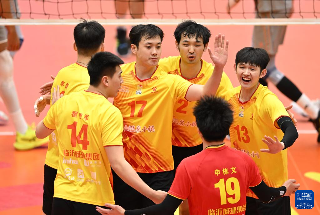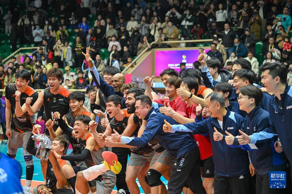 3月6日,天津食品集团队队长毛天一(中前)庆祝球队获得赛点。