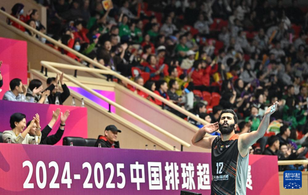 3月6日,天津食品集团队球员埃斯凡迪亚尔在扣球得分后庆祝。