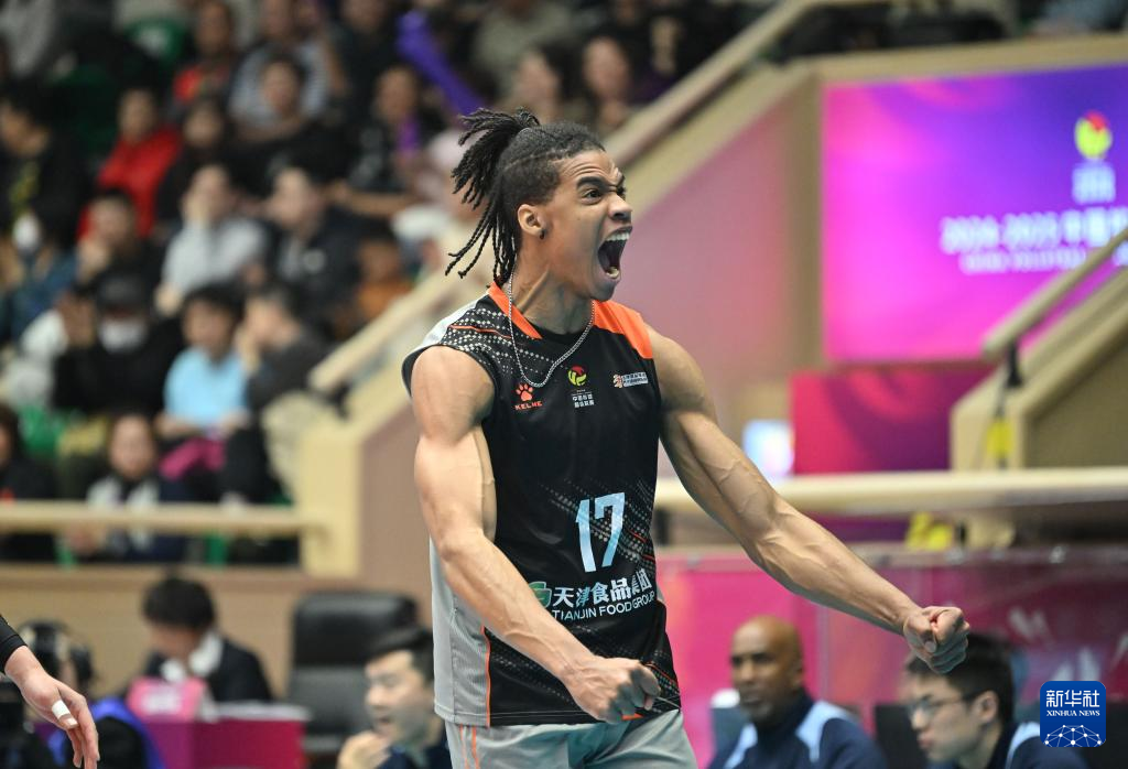 3月6日,天津食品集团队球员亚历杭德罗在扣球得分后庆祝。