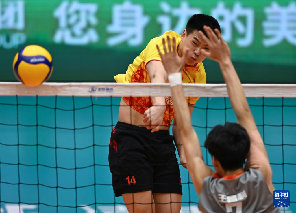 3月6日,天津食品集团队球员袁党毅(左)在比赛中扣球。